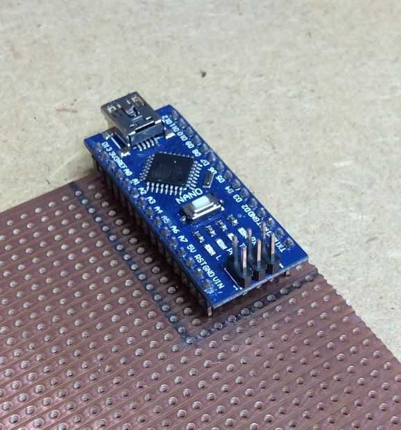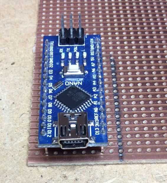 Lugar el nano en el tablero en los agujeros por lo que está apuntando lejos de usted, dejando una columna de agujeros vacíos entre el nano y el borde del tablero. Dejando otra columna de agujeros vacíos en el otro lado de la marca nano la columna siguiente con una línea de lápiz. Marca la primera fila vacía de agujeros en a tapa del nano.