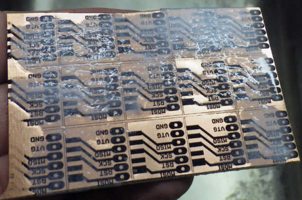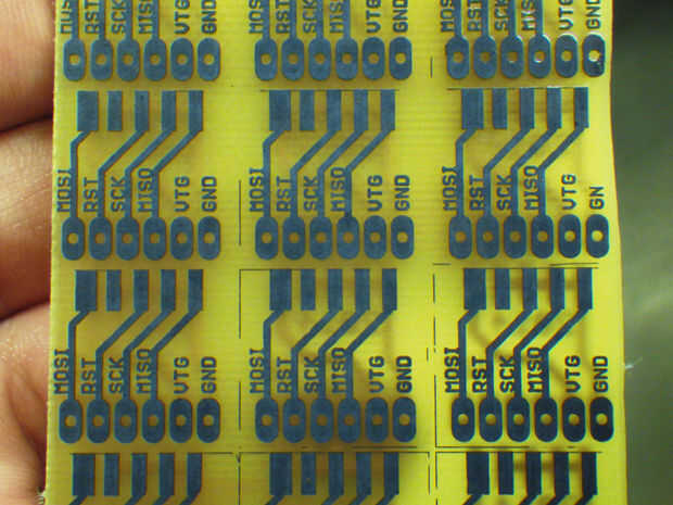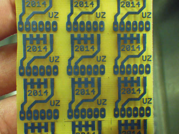 Utilizando el método de transferencia de toner coloca un par de tableros idénticos en una sola pieza de material de placa de circuito con revestimiento de cobre doble cara. La alineación no fue perfecta, principalmente porque la pila de dos hojas de papel y la placa de circuito no encajaba en mi laminadora modificado.