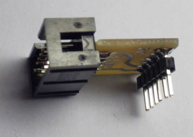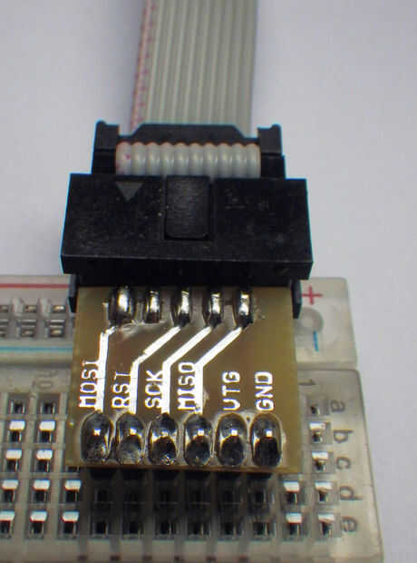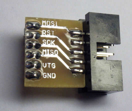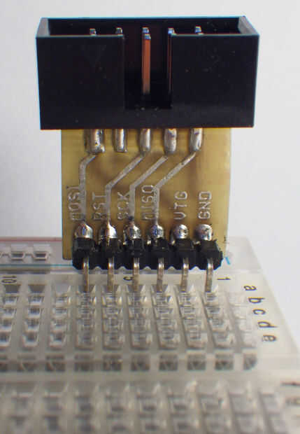 No hay mucho que decir aquí. Hay exactamente dos cosas soldar a la placa de circuito: el conector de 10 pines IDC y el pinheader de 6 pines. Por supuesto se puede también usar a un pinheader de 2 x 5 en lugar del conector IDC. En mi diseño el pin 1 del conector se muestra como un cojín más grande en el circuito, identificar la posición correcta del conector o conectado el cable.