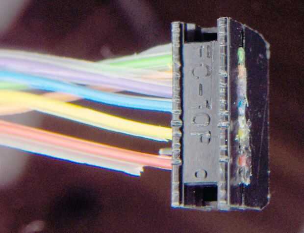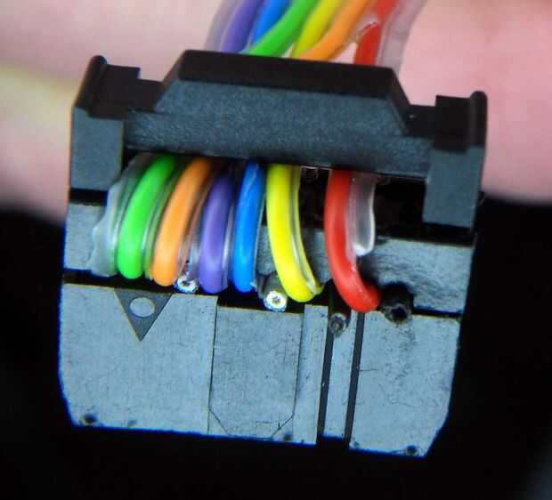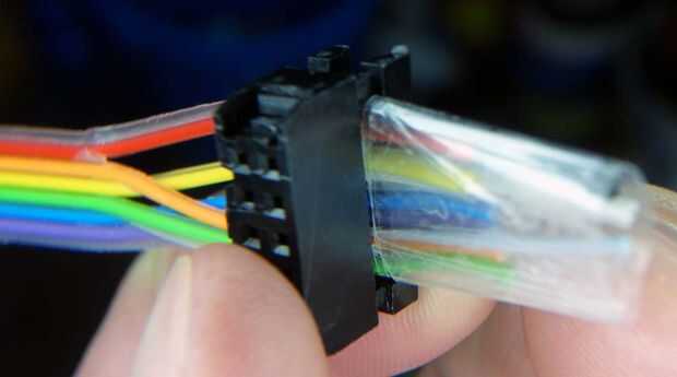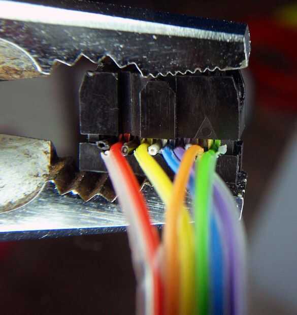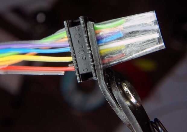 Si todos los cables parecen estar bien cerca de las dos partes con un par de pinzas. Tenga cuidado de no dañar a la toma mucho. También hay herramientas especiales para ello. Una vez cerrada la toma, cortar la parte sobrante con la cinta adhesiva y añadir los soportes de alivio de estrés.