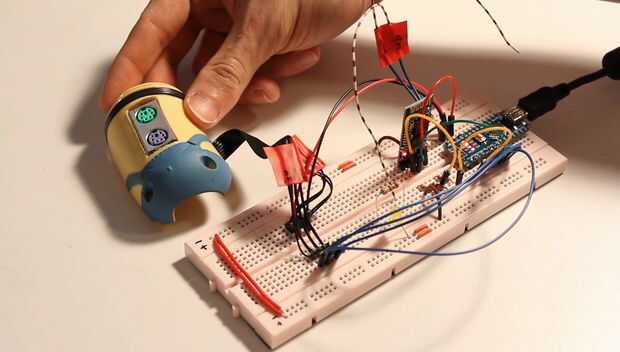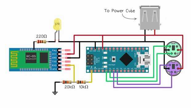 Siga el diagrama para conectar el puerto PS/2, el módulo Bluetooth y el puerto de alimentación del Arduino.