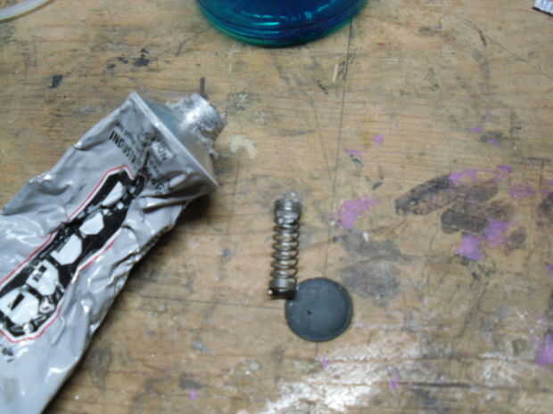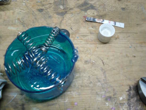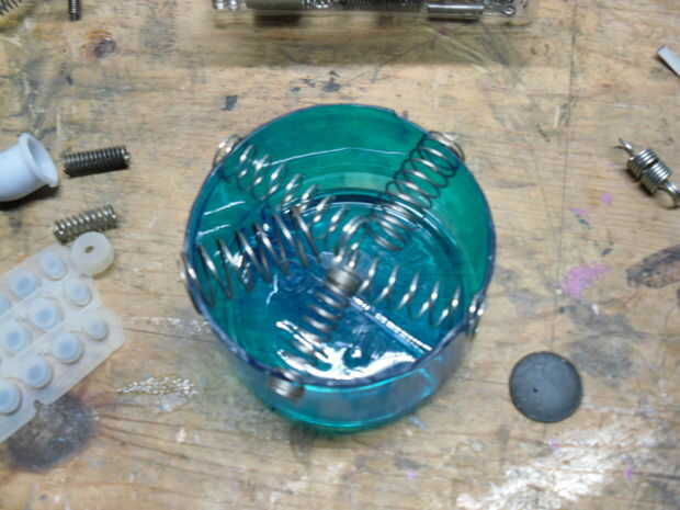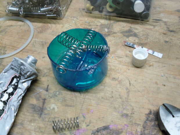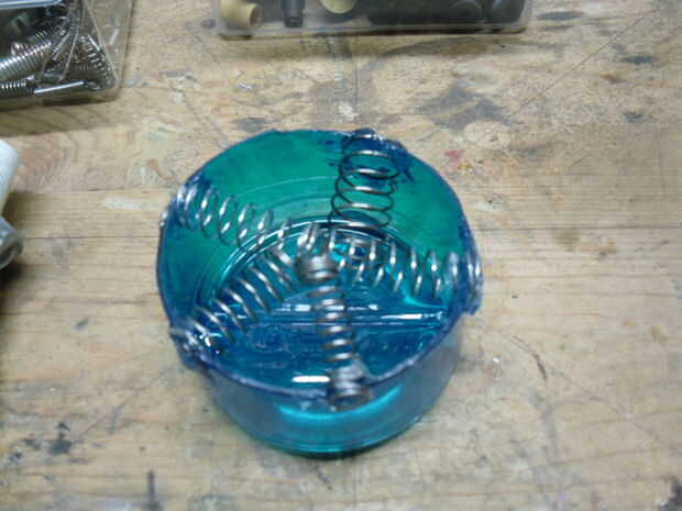 quería que los resortes se acercan a tocar pero todavía tienen espacio en el centro para permitir el movimiento. Idealmente todos serían del mismo tamaño y tensión. Lamentablemente desde que trabajo de salvamento he utilizado cinco que estaban bastante cerca de longitud. Me seco montar las bobinas de extremo de los resortes sobre el borde del inserto y jugaba con la configuración hasta que estuve satisfecho con espaciado. Con eso hecho apliqué E-6000 a las bobinas del extremo de los resortes y el borde del inserto luego montar los resortes en su lugar. Usé plástico de desecho para difundir el E-6000 uniformemente sobre los extremos de los resortes para asegurar la máxima retención. Entonces permití que se seque.