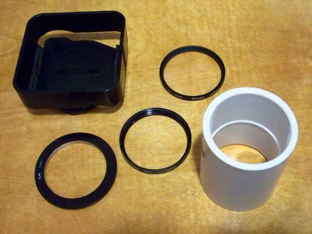 Viaje a la bandeja de partes de $1 en la tienda cámara local acogedor para las brocas roscadas: hay una amplia selección de filtros y esas cosas. La importante para la cámara aquí es una parte del hilo de rosca 49mm interior diámetro lo suficientemente grande para que permita que el elemento delantero se extienda a través de. La rosca frontal debe ser probablemente 52mm o más grandes (para reducir el viñeteo, más abajo).
