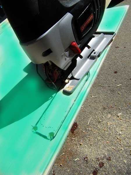 3. Utilice una broca grande y perfore un agujero en cada una de las esquinas del contorno de la manija.  Ir todo el camino por la parte superior (cyan) para las hojas de la parte inferior (canela).  ¿Por qué?  El agujero le ayudará a guiar la sierra al cortar el resto del mango.  Especie de.