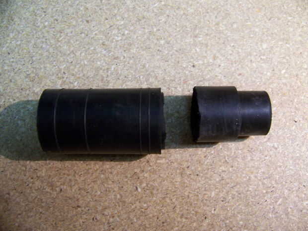 1. Coloque la manguera en vicio (o lo que usas para cortar manguera) 2. corte a la longitud deseada. Dos y media pulgadas debe hacerlo. Si está utilizando el adaptador de la manguera del lavavajillas, cortar justo donde el adaptador va abajo en tamaño (ver foto)