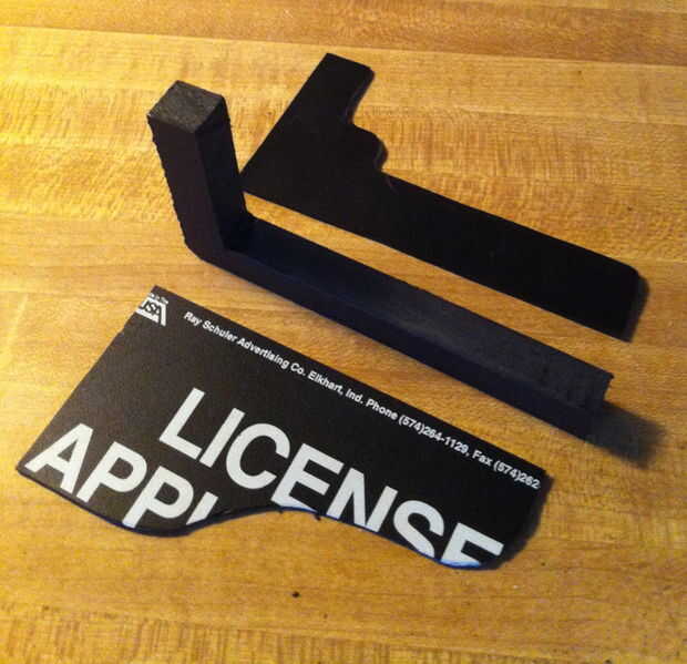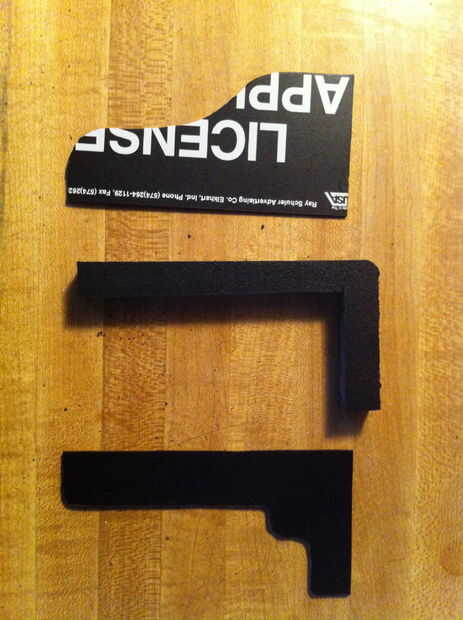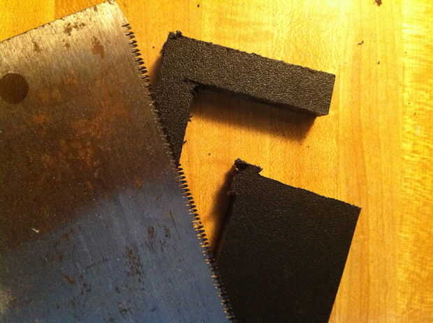 Por suerte, el "estribor" era el espesor correcto para mi teléfono. Comencé cortando una forma de "L" de ella una 1/2" ancho todo el camino alrededor. Como los extremos de la "L" extiendan más allá del centro del teléfono a ambos lados por aproximadamente una mitad pulgada debe ser fino.