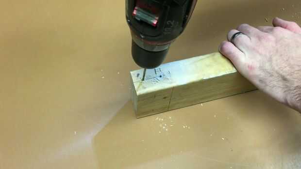 Marque el 2 x 4 como se muestra en la imagen 1 y 2. Taladre agujeros guía en las marcas en los bordes superior e inferior de 2 x 4 (imagen 3). Para los dos agujeros a través del lado de la 2 x 4, usé un taladro de 3/8 bits. Elegí esto porque cabe el iPhone 6. Si su teléfono o su caso es más grueso que 3/8", entonces utilizar la broca adecuada y ajustar otros agujeros según sea necesario.