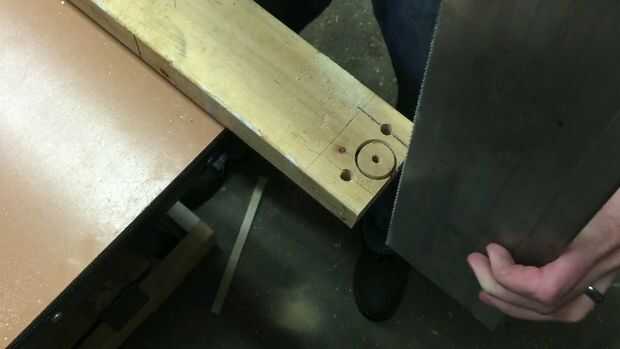 Utilice la Sierra de su elección para cortar a lo largo de las marcas de 3/4". El borde que tiene dos agujeros en él puede cortarse gratis (imagen 2). El otro borde que sólo tiene un agujero piloto en el se puede cortar más corto, pasando el gran agujero perforado en el lado (imagen 3). Puede entonces ser cortado de la 2 x 4 (imagen 4).