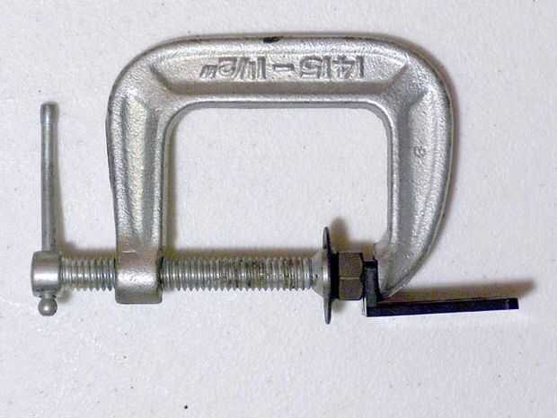 Pegar el tuerca-lado de la tuerca de giro libre a la parte inferior de la abrazadera de ángulo recto (ver foto). Asegúrese de que tienes las superficies muy limpias y utilizar el adhesivo adecuado, allí no es mucha superficie pero esto tiene que soportar el peso de la cámara. Utilice una abrazadera en C Sujete el soporte firmemente en su lugar y deje que se seque durante la noche.