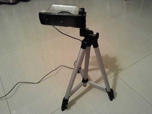 Finalmente, coloque el conjunto en el trípode. Realmente sería una buena idea para probar cómo la botella se ajusta con el trípode antes de conectar la cámara web en sí mismo en el caso de algunos cambios deben hacerse.