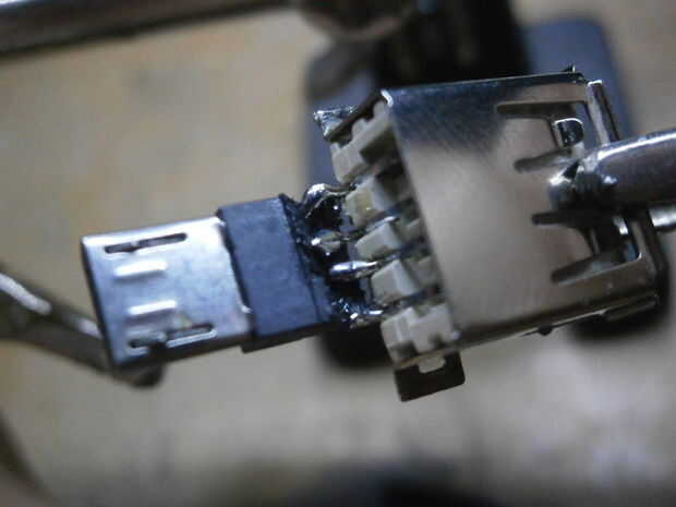 Una vez que la soldadura los pines juntos su tiempo para soldar los dos conectores USB, antes ver que pin lo que está en las fotos de pinout arriba. Después de soldarlos, cubrir las conexiones con pegamento caliente, los solean y hacerlos stonger.