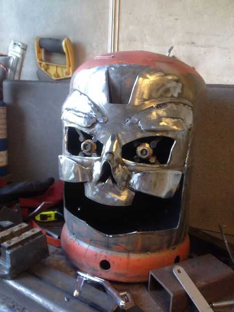 Los ojos fueron fabricados con trozos de tuercas y tornillos y barra hexagonal soldadas con autógena juntas y soldadas en el interior de la botella. Generalmente hago todas mi amolado y lijado final del proyecto pero decidí triturar y arena mientras que progresó el proyecto.