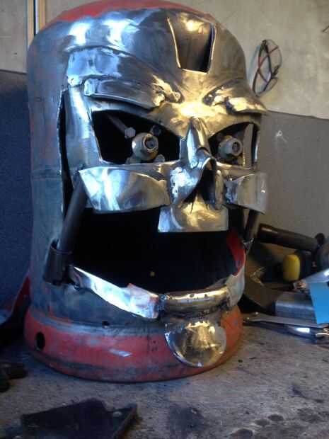 Con trozos de metal fabricado la línea del mentón y la mandíbula.