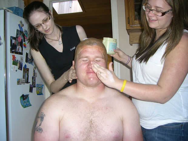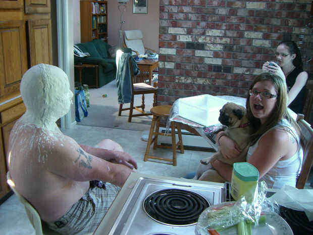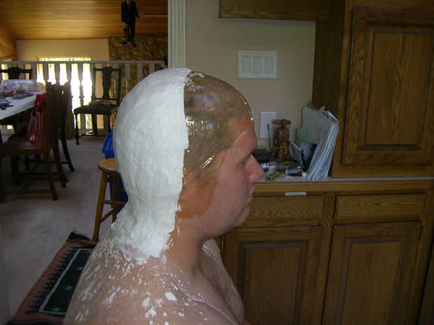 A continuación haces el frente! Puede utilizar la misma técnica como hiciste la parte de atrás, pero lo que funcionó mejor para mí fue hacer un 'barboquejo' y luego 'rellenando' el rostro. He puesto trozos pequeños sobre los ojos, entonces justo antes de hacer la nariz tenía mi bro poner pajitas de plástico ligeramente encima de su nariz para que pudiera respirar. Salí de la boca hasta el final por si acaso había algún percance de respiración.