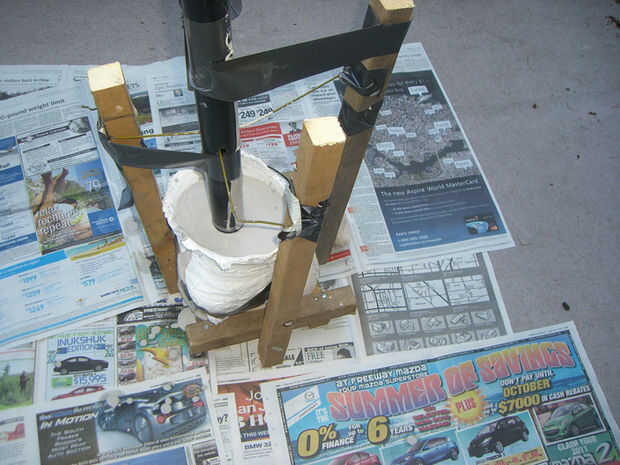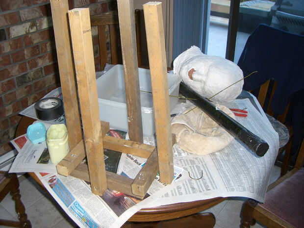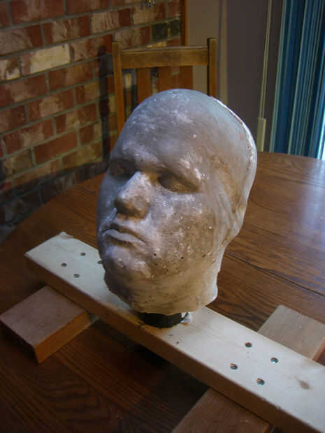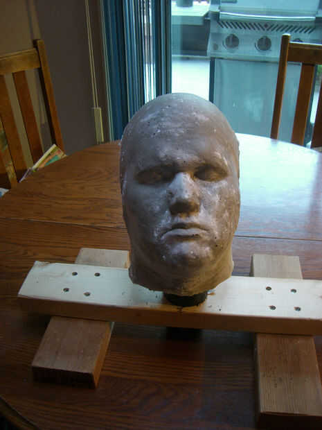 Aquí está Cómo hice mi sistema de apoyo para la cabeza del molde. Para éste, hicimos las cosas un poco diferente. Mi cuñado entró en el garaje, agarró lo que pudo encontrar y hecho el sistema puedes ver en las fotos (mucho mejor que mi soporte de cabeza en un cubo). En ambos casos, estos apoyan eran temporales, barato y hecho con lo que teníamos alrededor de la casa. Viene peor en peor, usted puede tener alguien simplemente mantenerla para usted. Hicimos la armadura del soporte de la misma manera como este, sólo sustituía en un trozo de tubo para el anclaje. Usted no lo necesita, pero es bueno si usted quiere ser capaz de girar su cabeza alrededor mientras trabaja.