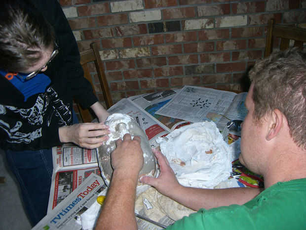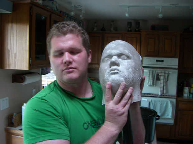 El Ultra Cal 30 curará rápidamente. Una vez que el sistema completo (debe ser roca dura y fría al tacto) debería poder sacar fácilmente el plástico de la cáscara de París. Cuando hice una copia de mi cabeza, el molde de yeso de París salieron intactos y muy fácilmente - molde cabeza bro-en-ley no era tan seco, y creo que nos dejó la primera capa de vaselina en demasiado ya y empapado a través de los vendajes, haciéndolos un poco caldoso. Él todavía tiene un * realmente * buen elenco, es solo que el molde estaba arruinado. Su cabeza salió más detallada que el mío - probablemente porque cuando mi esposo fue envolviendo mi cabeza en vendajes, era amoroso y preocupado por mi ser, mientras que cuando yo estaba colocando el yeso de París en el bro solo estaba abarrotar en cada nook y cranny.