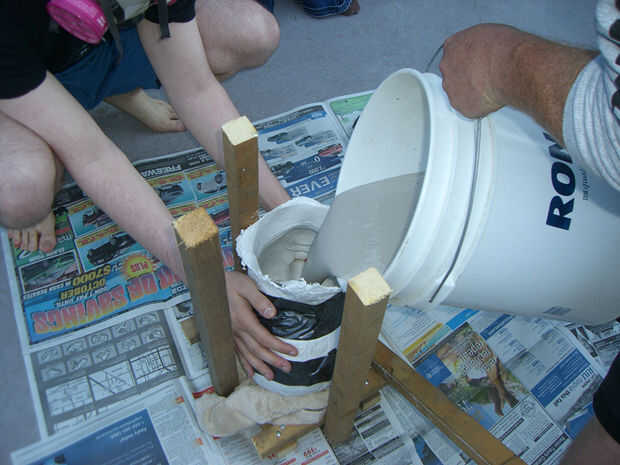 Poner el molde en su 'sistema de apoyo.' y agregar rápidamente en un pedazo de tubo/anclaje. En este caso, tuvimos un pedazo extra largo de tubo que estabilizó con cinta adhesiva y alambre para el soporte. (El tubo de exceso se retira luego).