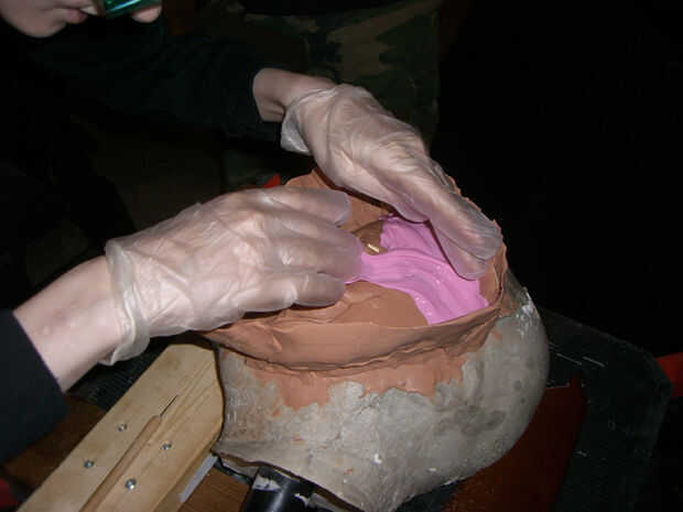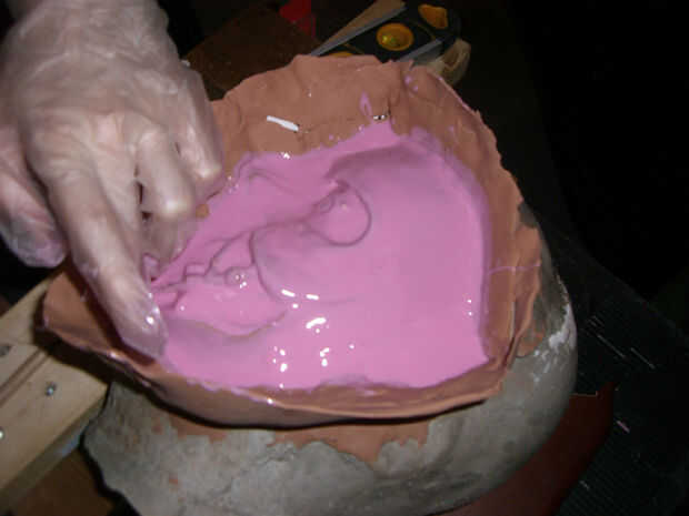 La silicona era más viscoso de lo que pensábamos sería - parecía y actuaba un poco como el rosa chicle. Cubrimos la escultura con una capa de silicio (visto aquí, casi hecho), esperó un poco, luego vierte algunas más, hasta que ya no vemos la arcilla. Hicimos todo esto gradualmente y en etapas para evitar burbujas de aire.