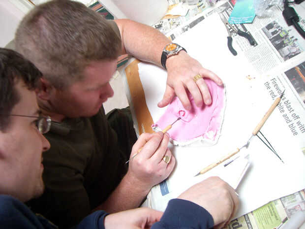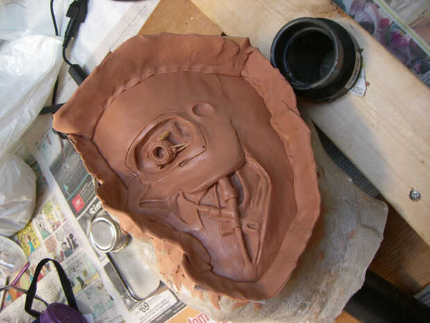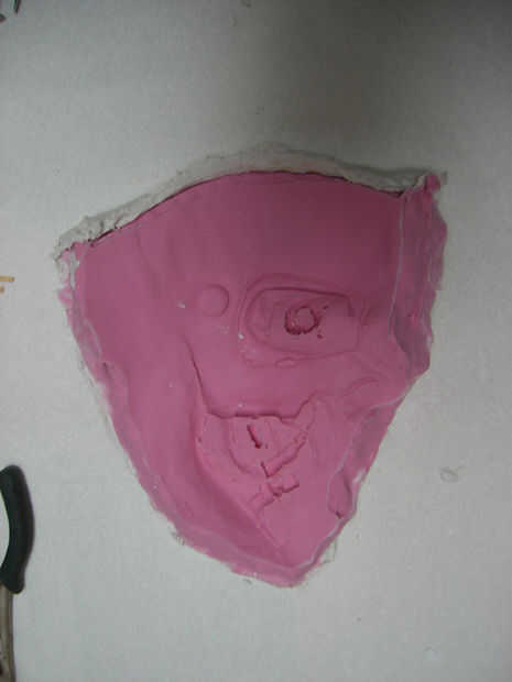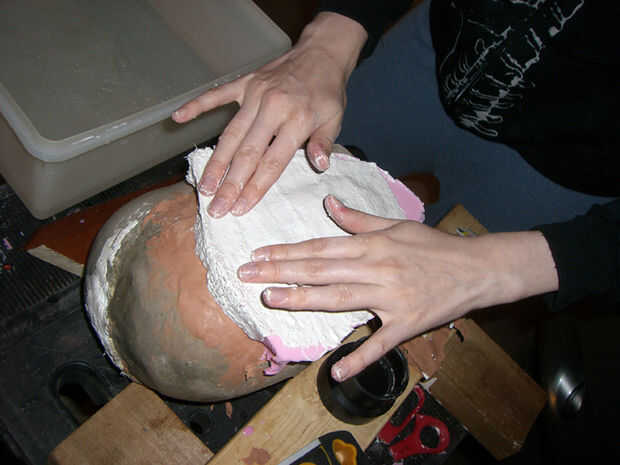 Después de curaciones del yeso de París, puede girar ambos moldes y limpiar hacia fuera el molde de silicona. Debido a varias zonas retentivas y pedacitos de raras (alrededor de los ojos y las mejillas), tuvimos que cortar la silicona estratégicamente para conseguir madera arcilla en el molde y para asegurar que la resina sería capaz de entrar en todos los lugares correctos.