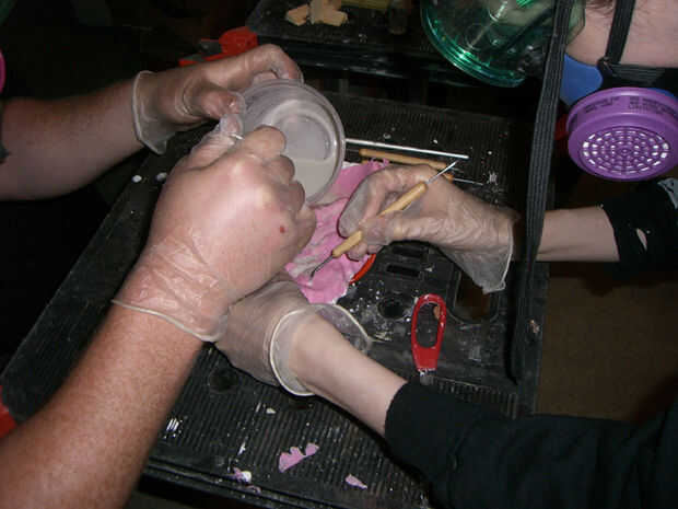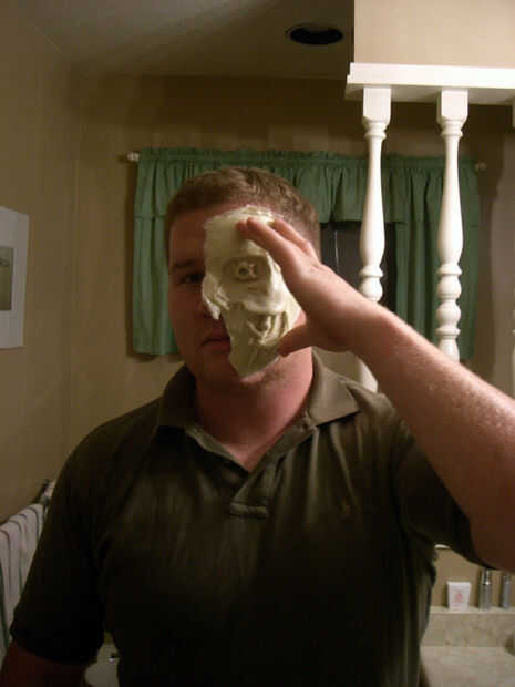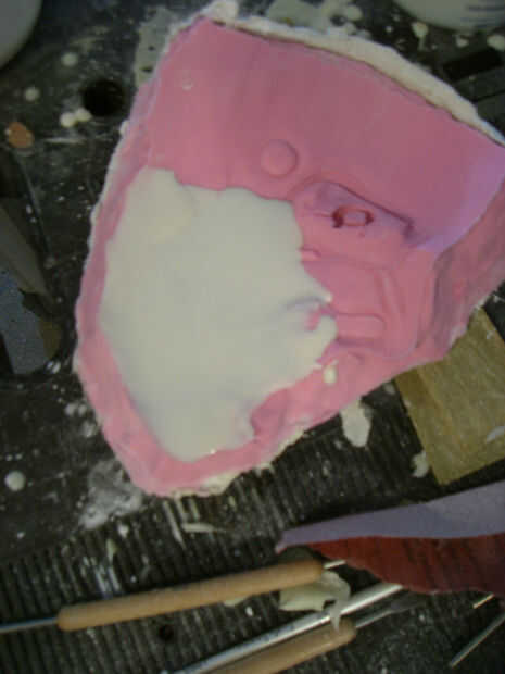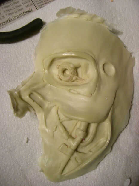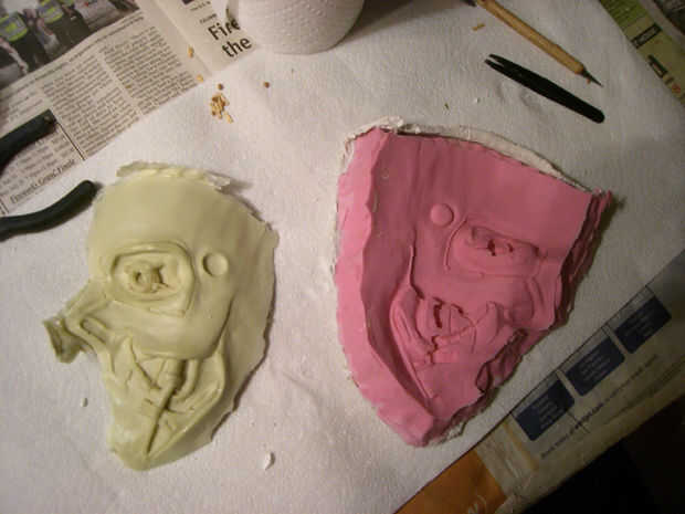 Terminamos haciendo dos moldes más (uno del 'ojo superior') y la mejilla' inferior' por lo que se podría mover. Se utilizó la resina inicial fundida para cuando la piel de la pieza fue esculpida.