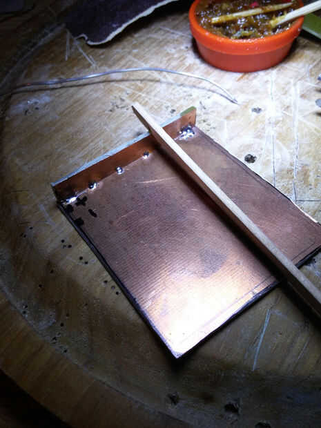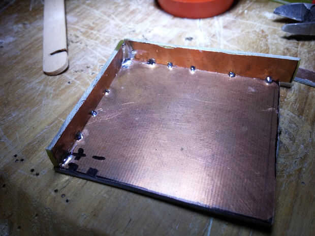 Después de lijar todos los bordes, usar algo para manejar los laterales de la caja y empezar a soldar en los puntos como lo hice en la primera foto. Si desea comprobar la perpendicularidad de la pieza soldada, usar la batería como una plantilla y ajustar el ángulo, si es necesario.