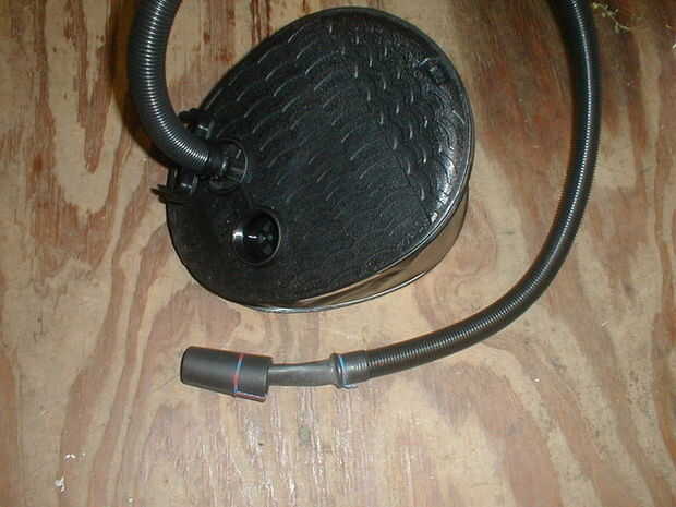 Solución: había fabricado un adaptador de piezas de chatarras (un embudo de plástico, llanta de bicicleta y un alambre de cobre). Adaptador funciona muy bien. Permanece bien insertado durante el bombeo de pie. Se infla colchones rápidos. Proyecto consume 45 minutos.