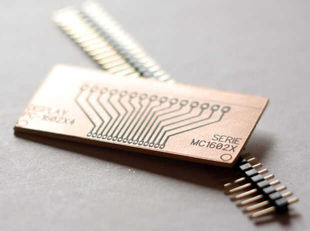 Sumergir la placa en ácido (generalmente cloruro férrico) y agitar un poco el líquido para acelerar el proceso. Después de aproximadamente media hora el pcb estará listo. El pcb sale amarillo, porque el ácido dejó este color en todo lo que toque. Se retira fácilmente con agua, pero ten cuidado para no ensucia su ropa porque el ácido consume a tela.