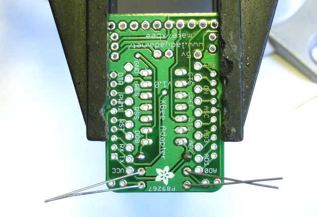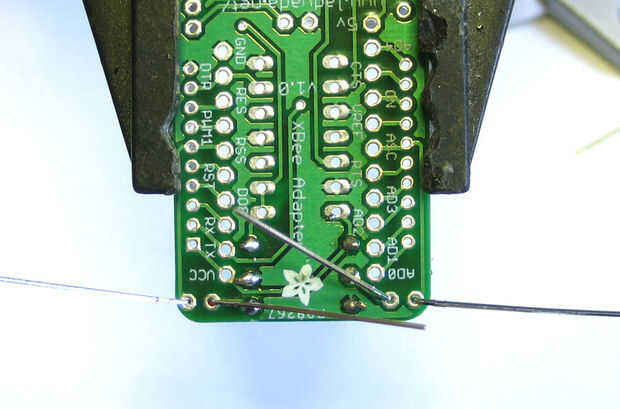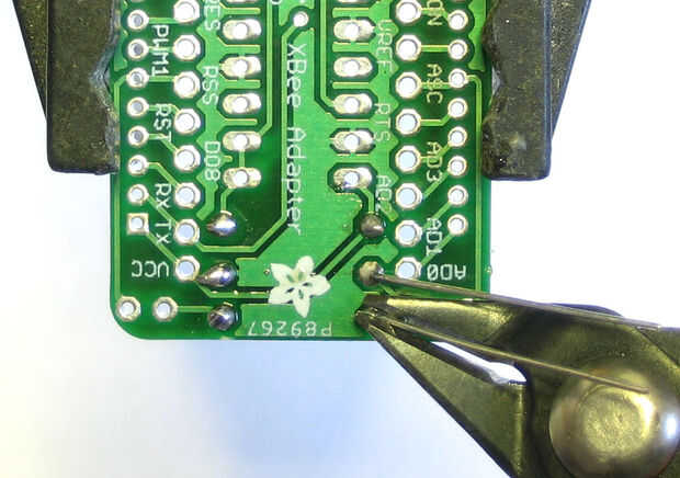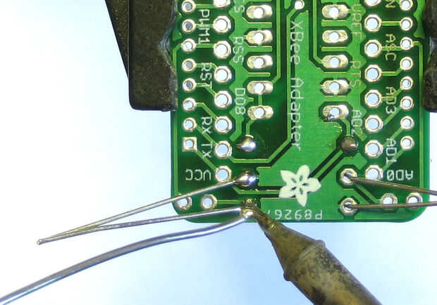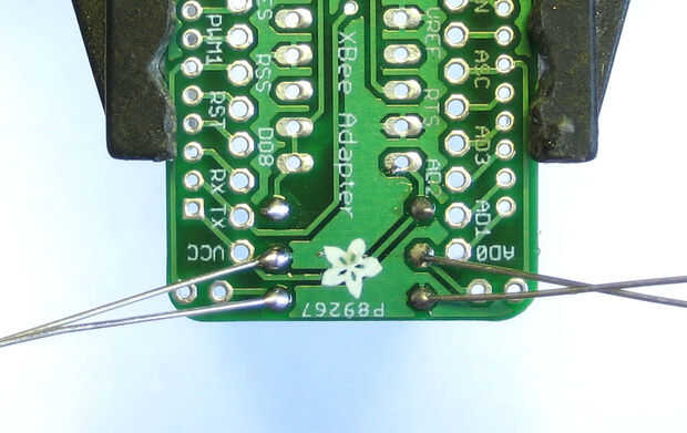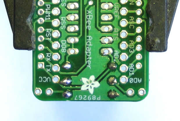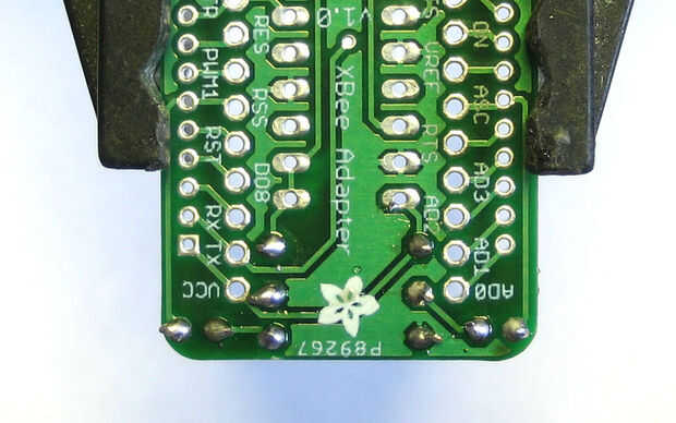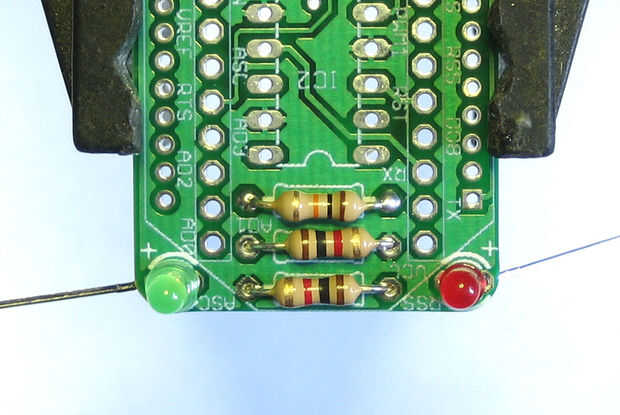 A continuación están los dos LEDs: uno LED indica que el XBee es para arriba y correr ("Asc"), los otros indcates cuando datos es recibidos por la unidad "(RSSI del) y es muy útiles para la depuración.
