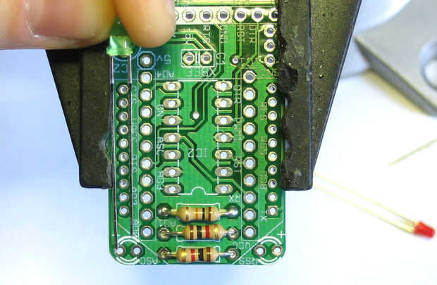 LEDs están polarizados, a diferencia de los resistores. Esto significa que deben soldarse en correctamente para que funcione. El cable más largo del LED es positivo y debe ir en el agujero marcado con un +. Ver las imágenes para una vista detallada de cómo se colocan los LEDs. Si se colocan mal, los LED ' s simplemente no se encienden y puede ser muy confuso