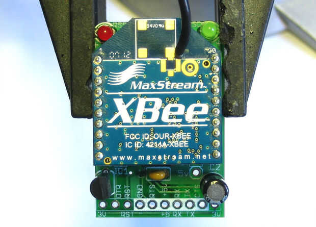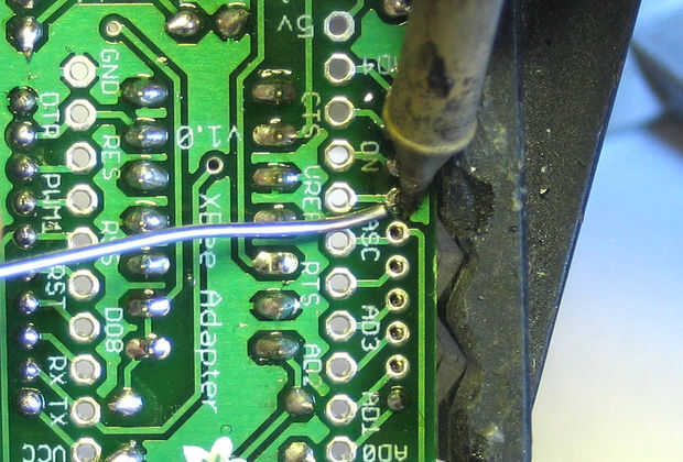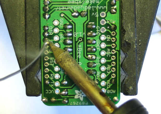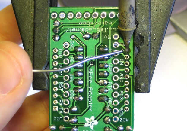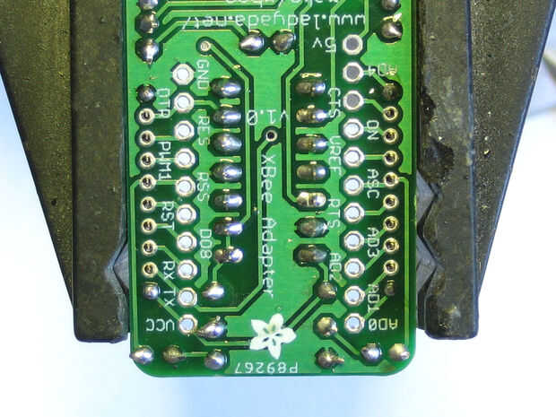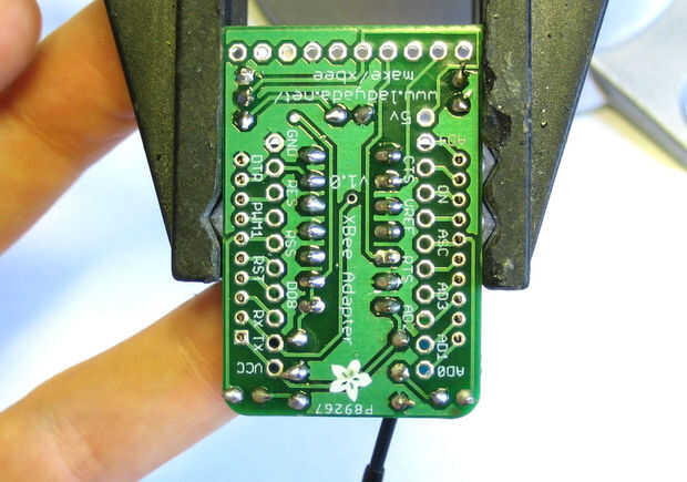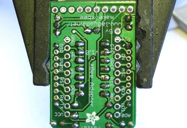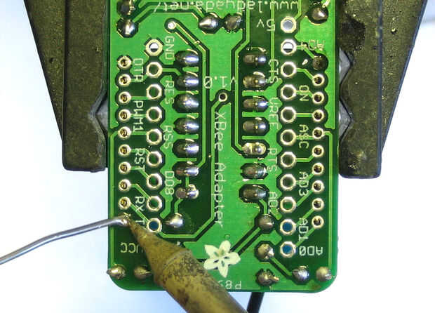Voltee la placa y sujete los encabezados de XBee con un dedo para mantenerlos en su lugar.