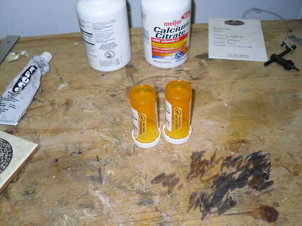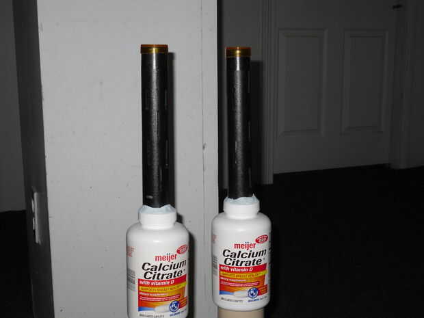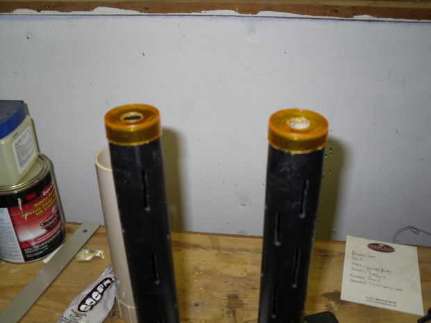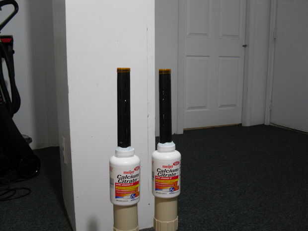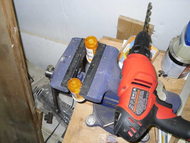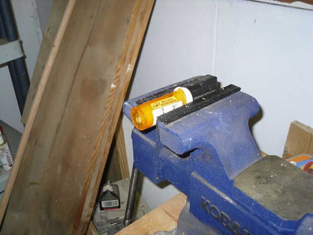 Fijar las botellas en mis fondos de tornillo de banco hacia arriba. Taladró el centro de la parte inferior de la botella con una 17/64" broca. Esto quita aproximadamente 1/3 del material y redirigirá (hipotéticamente) la mayoría del aire a los lados de las extensiones.