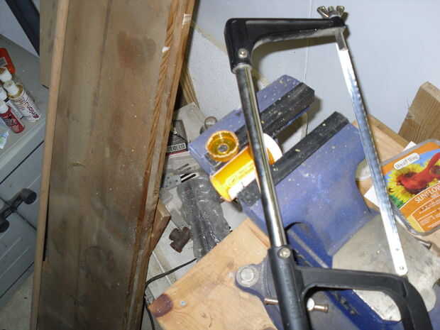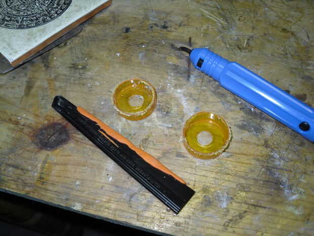 Con los agujeros perforados me sujetan las botellas horizontalmente en el tornillo de banco y utilizar mi sierra para cortar los fondos de las botellas. Luego usé un cuchillo y un herramienta de desbarbado para limpiar los bordes.