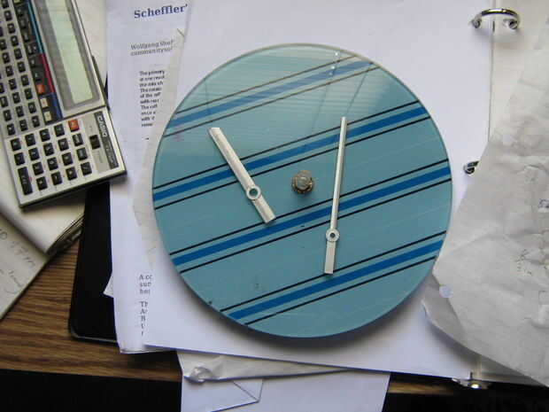 Tuve que encontrar las ruedas interior dado vuelta los minutos y segunda mano y cortaron las piezas que subieron por el medio. por lo tanto me quedé con el eje que gira la manecilla de las horas. La manecilla de las horas es fricción encaja en el eje.