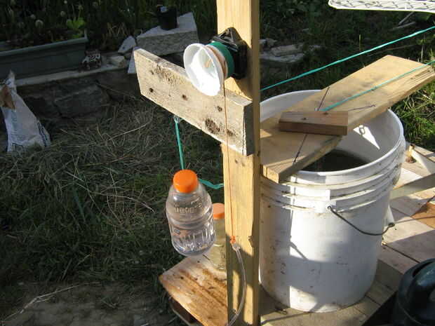 Gotas de flotador y tira el verde cadena, este se convierte la cocina solar y tira para arriba el contrapeso (la botella de la bebida de un litro).