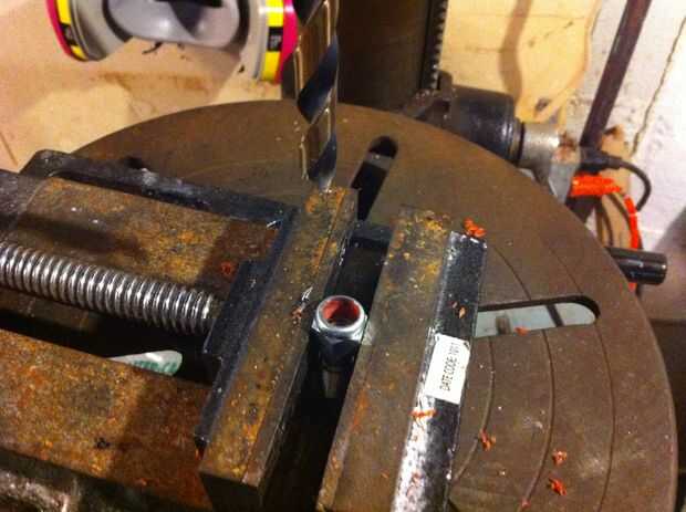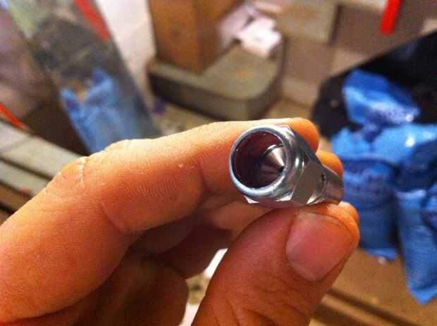 El perno banjo conseguí en ebay tenía un arnés de cableado que se le atribuye. Después de cortar los cables con pinzas, perforé el plástico restantes con una broca de 7/16 bit, dejando una cavidad hueca dentro del mismo. Después de la perforación, tuve que usar un destornillador para apalancar algunos plásticos difíciles.
