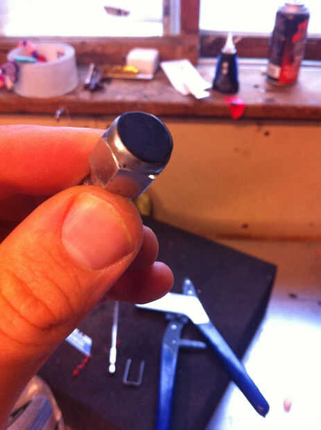 El agujero perforó era levemente demasiado grande al hilo con mis llaves, así que tuve que llenar primero con JB Kwik, esperar unas horas, luego volver a perforar un agujero de 10mm. Nos parecía un poco tonto para rellenar un agujero para que podía perforar otra vez, pero consiguió el trabajo.