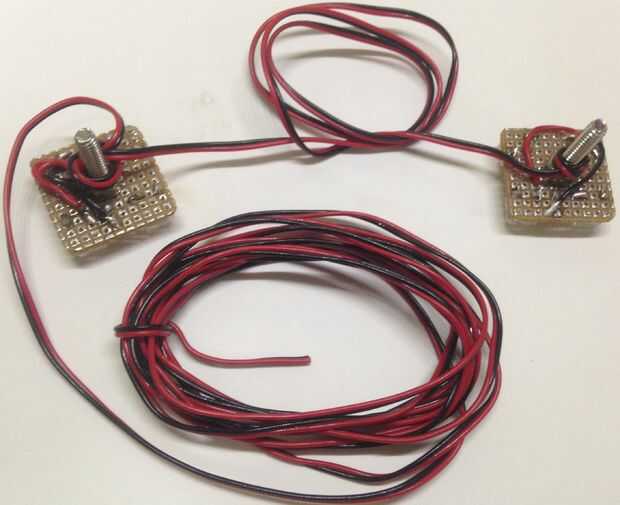 Corte el alambre en dos pedazos. El más pequeño trozo de alambre se utiliza para conectar entre dos luces. El cable más largo debe ser utilizado para conectar desde las lámparas a la principal matriz de LED blanco. Suelde el cable más pequeño a uno de los PCB. Luego conecte el cable más largo junto con alambre más pequeño a la segunda placa como se muestra en la figura 5. Fijar tornillos a los PCB y luego un nudo del alambre a los tornillos para evitar alambre conseguir de lo PCB durante la manipulación.