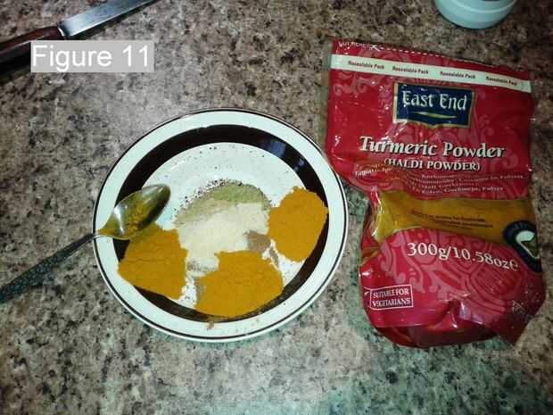 Curry es generalmente un agradable alegre color amarillo dorado. Eso es porque es tiene cúrcuma . Utilice tres cucharadas de cúrcuma.