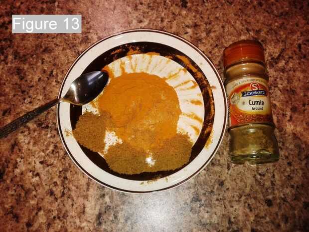 También agrego tres cucharaditas de comino. Comino se utiliza mucho en la cocina India, pero también en muchos alimentos mexicanos como enchiladas.