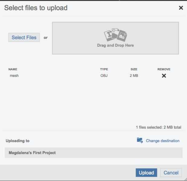 Arrastre el archivo .obj a la ventana señalada y haga clic en cargar. Haga doble clic en su vista previa del archivo para abrirlo. Puede cerrar el Panel de datos ahora.