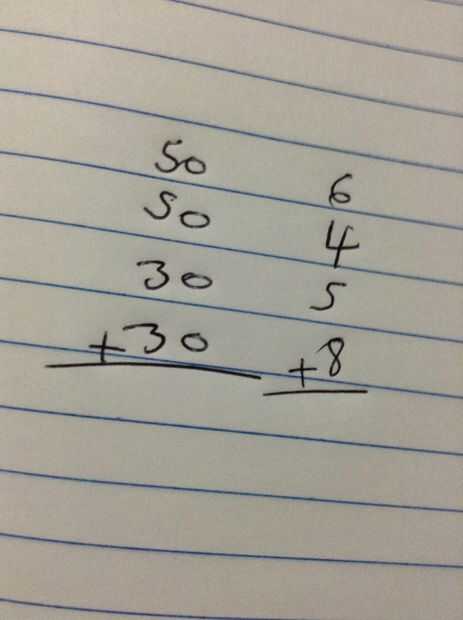 Es muy difícil añadir 56,54,35 y 38 muy rápido en su cabeza. Mi profesor de matemáticas de la computadora me enseñó este truco. Cada segundo dígito en cada número y añadir un cero en su lugar. Así que ahora es 50,50,30 y 30 que es igual a 160, pero recuerda que todavía tienes esos dígitos segundo 6,4,5 y 8 que se suma a los 23, añadir los 23 a los 160 que se suma a 182. Si tienes un problema como 16 más 20 quitar el 6 que hace 10, ahora agregar el 20 y el 10 es 30 ahora toma que 6 que tomó distancia de diez y añadirlo a la 30 que hace que la respuesta final 36.