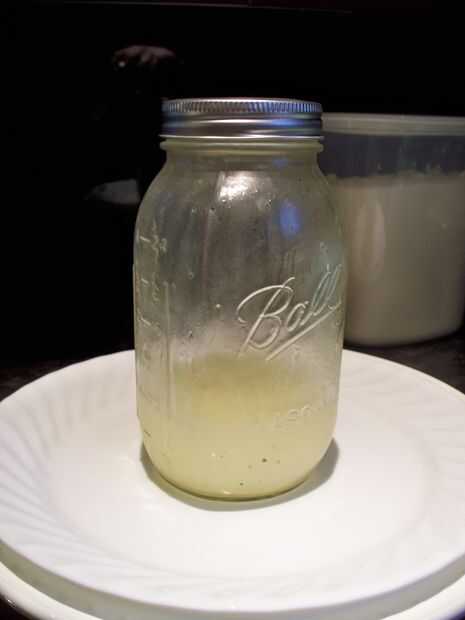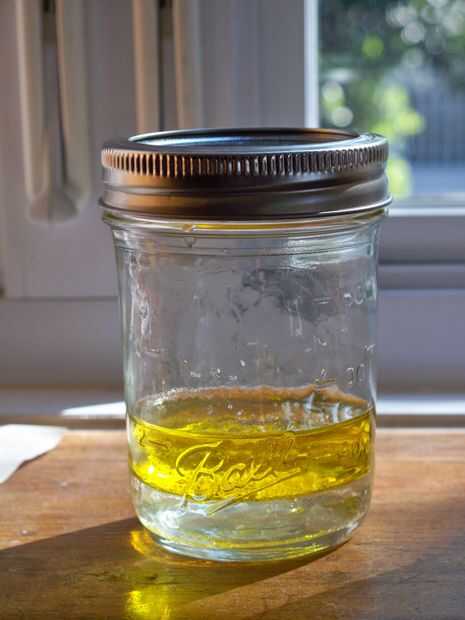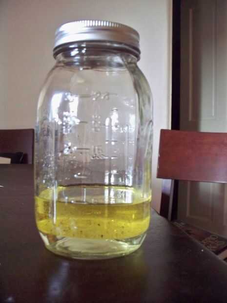 En las fotos que adjuntamos, la jarra más grande contiene 1 taza de aceite vegetal y mezcla de vinagre de vino blanco. El pequeño frasco contiene 1/4 de taza de una mezcla de vinagre de vino blanco y aceite de oliva.