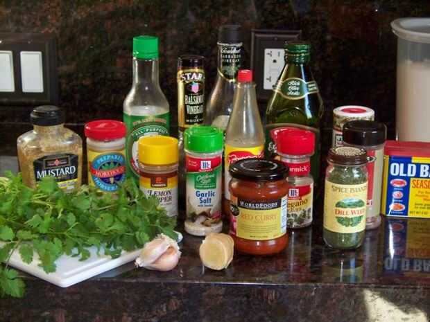 ajo picado, cebolla o chalote; hierbas frescas, especias, salsa de soja, salsa de ají, mostaza, miel