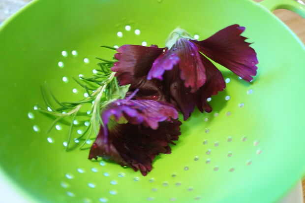 Me di cuenta que tenía una cena de trabajo en el último minuto y no había preparado nada.Por suerte, con un viaje rápido al jardín tiró algunos ingredientes poco ortodoxos juntos en una ensalada dulce y picante.Ingredientes:jardín verdes;flores de ca