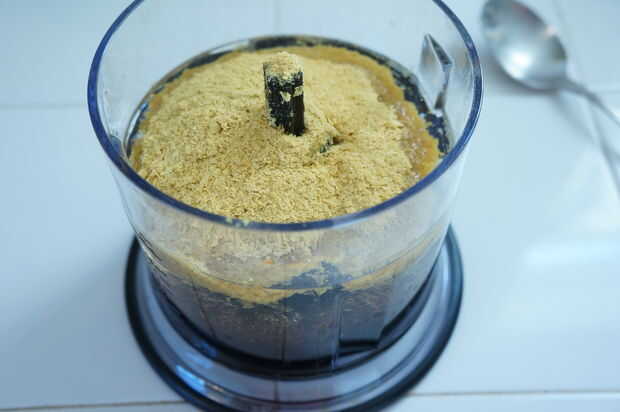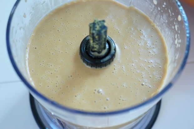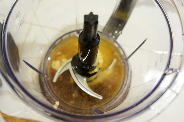 Añadir el aceite, agua, vinagre, salsa de soja, ajo, levadura nutricional y sal en el procesador de alimentos y mezcla hasta que esté cremosa con sin grumos.