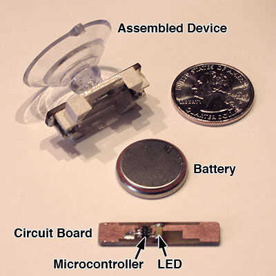 Dos componentes que suelen aparecerán en proyectos de LED y el microcontrolador son brilla por su ausencia: no hay ningún resistor limitador de corriente para el LED (el reloj de litio utilizado es intrínsecamente limitado en corriente), y no hay ningún condensador de desemparejamiento entre conductores de alimentación del microcontrolador (simplemente no era necesario en esta aplicación no crítica).