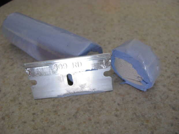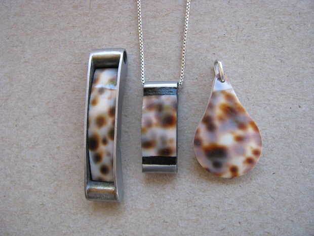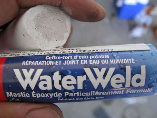 Este adhesivo es normalmente para arreglos de plomería rápida. Me gusta usar es para enlazar el metal para otros materiales como la concha de mar y plástico. Viene en un rollo que tiene un recinto interior y exterior. Corte la cantidad que necesites y mezcla los dedos. Endurece en minutos.