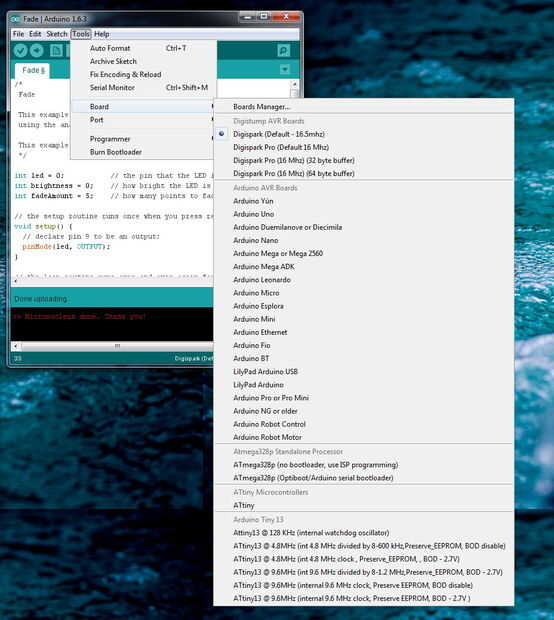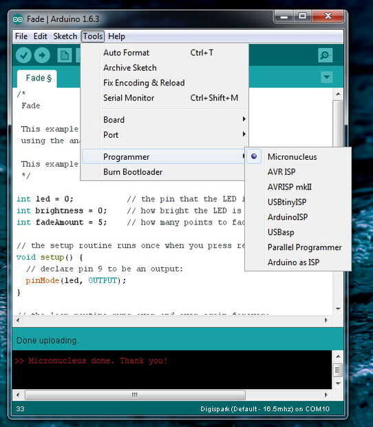 En el IDE de Arduino seleccione la placa como "Digispark (por defecto - 16.5 mhz)" en el menú de herramientas y su programador como "micronúcleos". Compilar y cargar en el IDE de Arduino como de costumbre, esperar la instrucción de enchufe en el dispositivo y luego en la parte inferior de la ventana del IDE (porción de fondo negro). Si todo ha ido bien, programación completa sin error. También es posible cargar fuera del IDE con micronucleus.exe pasando el nombre del archivo del programa compilado en formato hexagonal de intel.