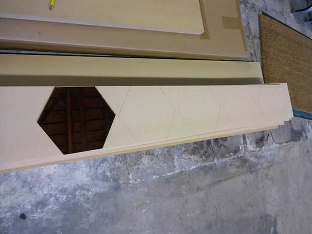 - Entonces, era sólo una cuestión de utilizar uno de los espejos como una plantilla y sacar hexágonos en las corte tiras de MDF, dejando una o dos pulgadas entre cada hexágono para asegurar que tenía espacio para hacer los cortes. (Por supuesto, dependiendo de lo práctico es con un serrucho, que definitivamente podría alinear el dibujado por hexágonos para un uso más eficiente de la madera, pero ten en cuenta que usted puede desear primer corte entre cada hexágono en el inglete vio para que sea más fácil de manejar durante el corte de ángulos).