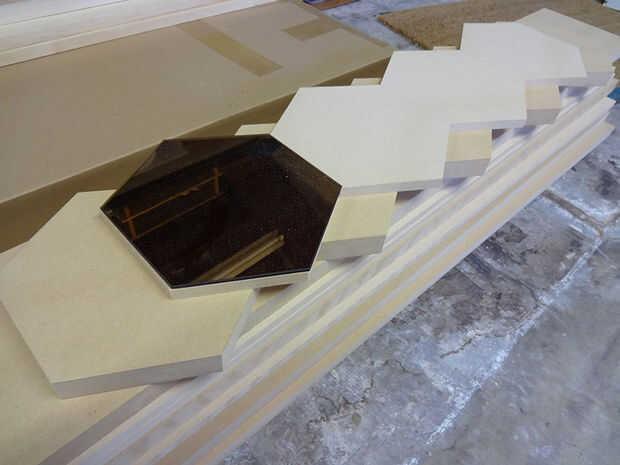 - Una nota importante aquí (que aprendí más adelante en el proceso): los espejos IKEA no son perfecto hexágonos. Los lados tienen algunas variaciones leves a ellos que pueden causar algunos problemas al intentar alinear los espejos con los hexágonos MDF cortados.